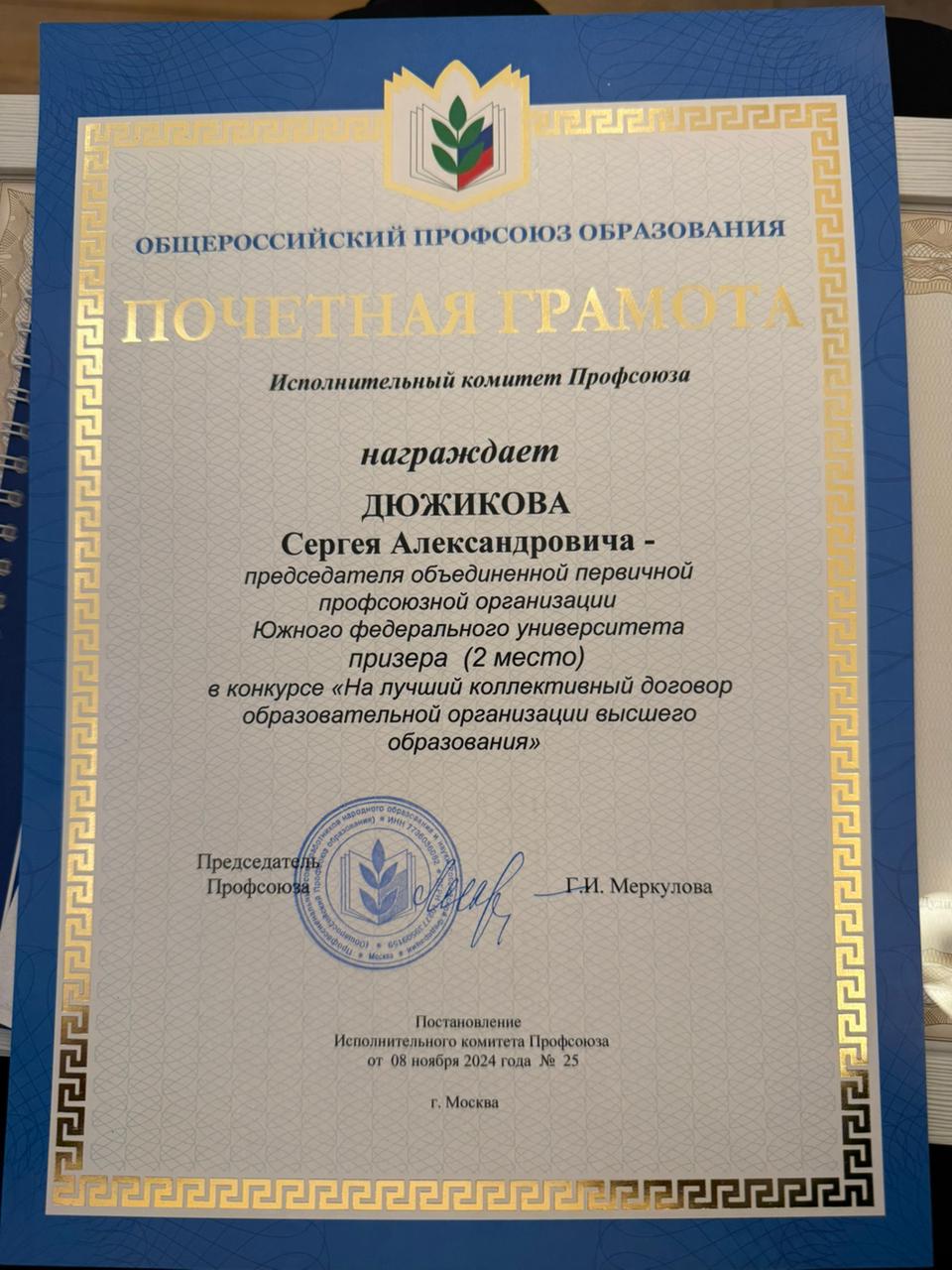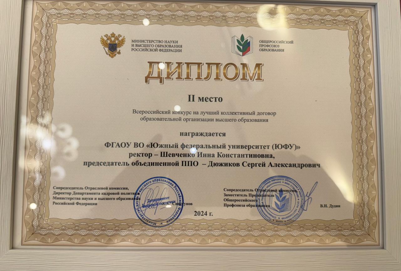 На всероссийском конкурсе на лучший коллективный договор образовательной организации высшего образования Первичная Профсоюзная Организация Южного Федерального университета заняла второе место.