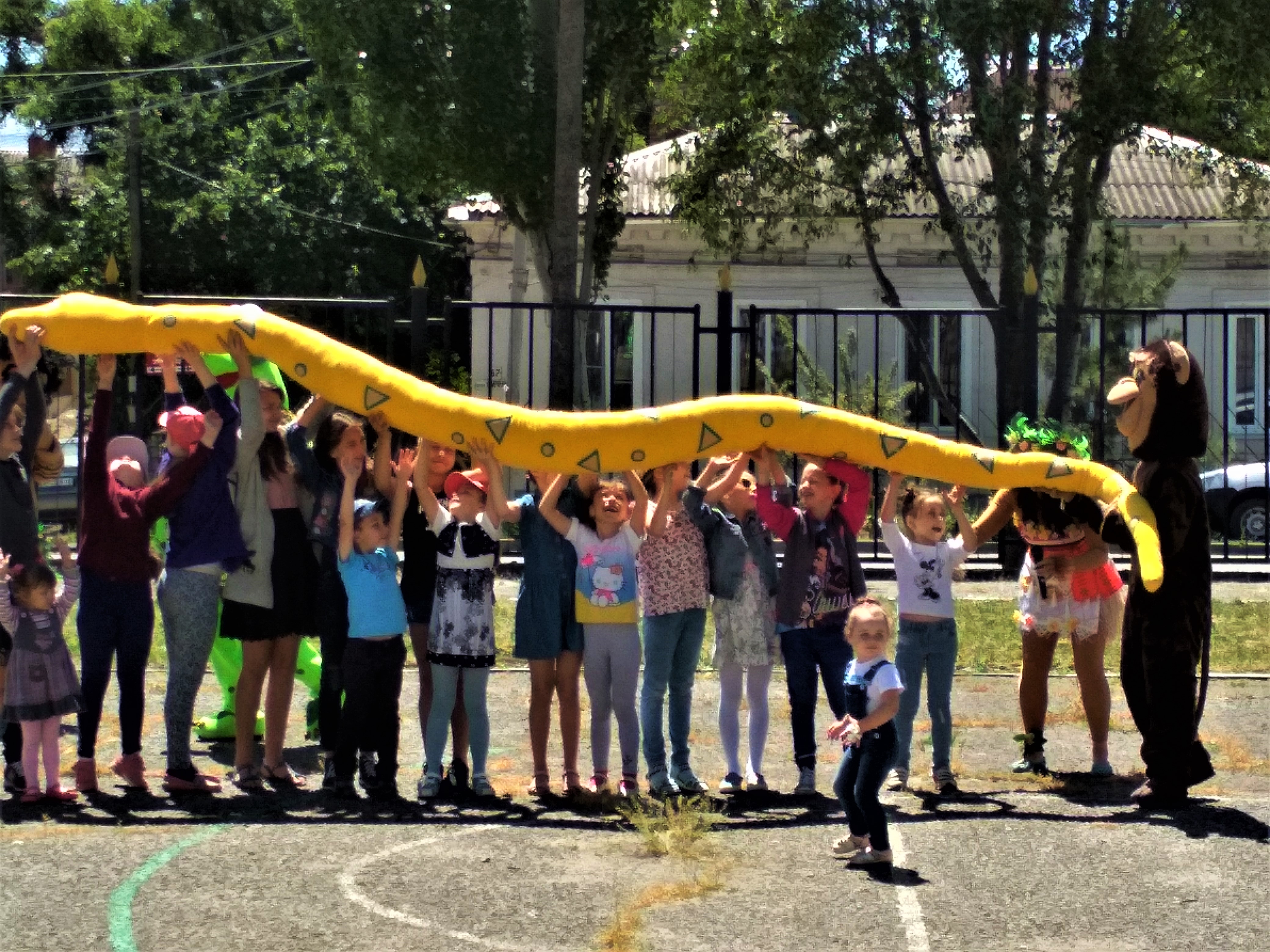 На спортивной площадке учебного корпуса "Д" ИТА ЮФУ детвора встретилась с Черепахой и Львенком, Обезьянкой и Драконом, попугаем Кешей, Муаной и Мау. Мультипликационные герои проводили викторины и конкурсы, игры с детьми, Ребята попытались пытались узнать длину удава, подружиться с попугаем , прыгали под дождем из мыльных пузырей.