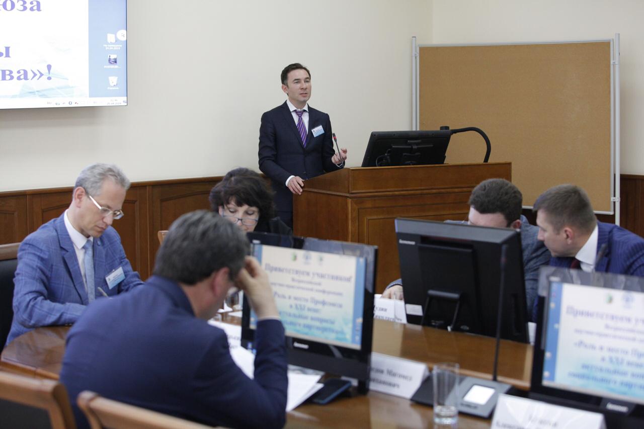 На пленарном заседании конференции с докладом об инновационных методах информационной работы выступил председатель Профсоюзной организации ЮФУ Сергей Дюжиков.