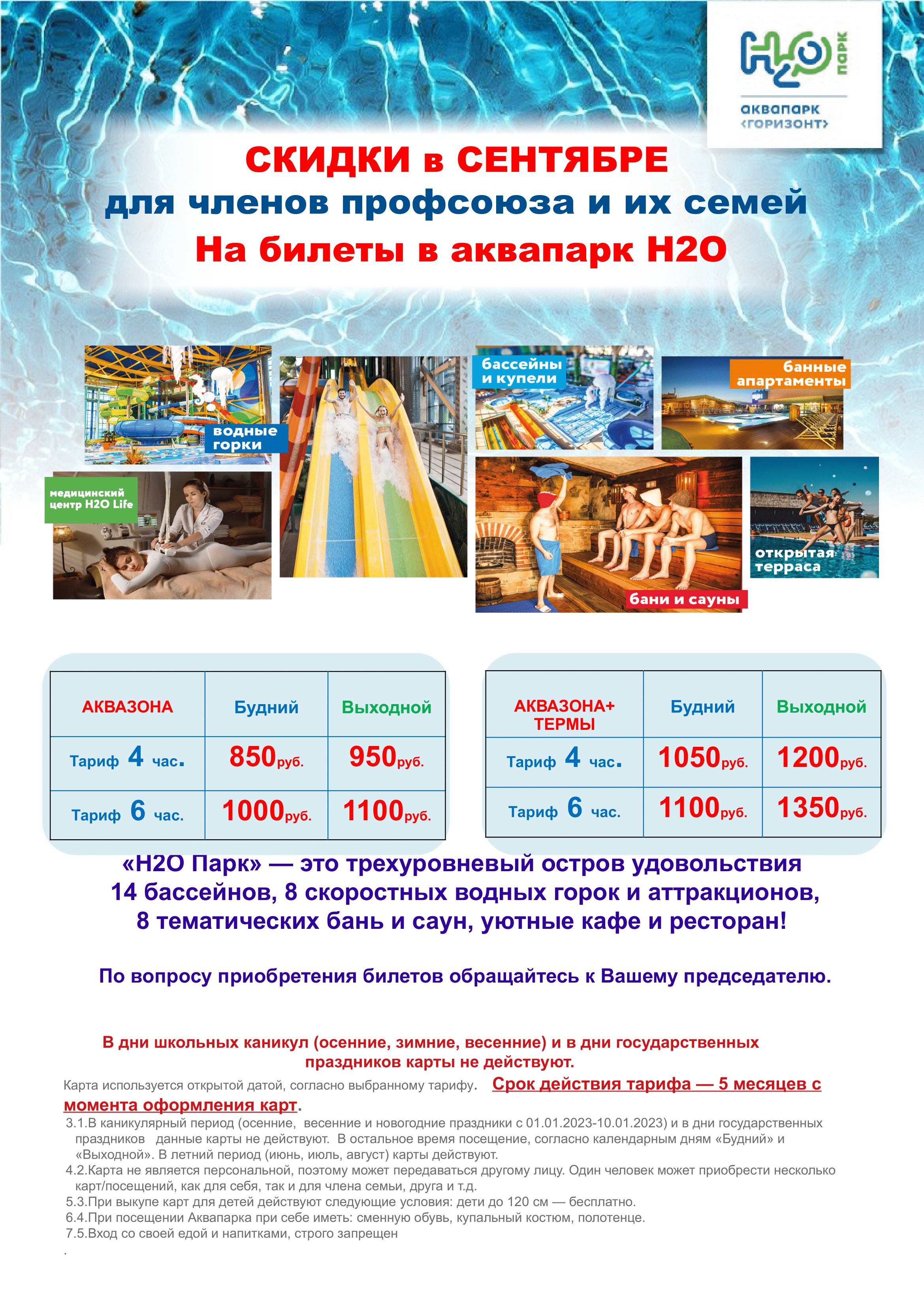 Выкупить билеты в аквапарк вы можете прямо на кассе с 20-27 сентября с профсоюзным билетом Скидка от 40-50% для членов профсоюза. Билеты действуют 5 месяцев со дня получения.